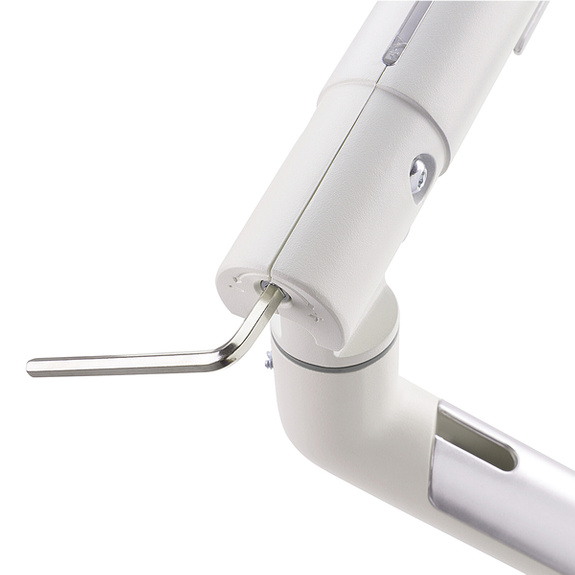 Ramię konstrukcji zostało wyposażone w wytrzymałą klamrę montażową, która umożliwia stabilne i bezinwazyjne mocowanie do krawędzi blatu lub innych powierzchni płaskich o różnej grubości, bez konieczności wiercenia. Montaż może odbywać się także poprzez otwór w blacie.